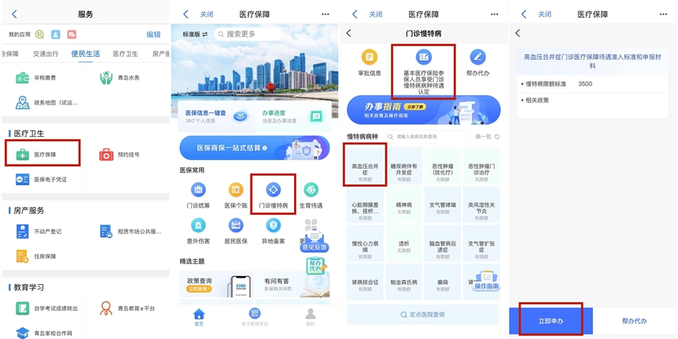 為方便家有慢性病、慢特病病人群體及家屬辦事,除到醫(yī)保工作站、定點(diǎn)醫(yī)院或醫(yī)保經(jīng)辦機(jī)構(gòu)辦理等門診慢特病辦理方式外,“愛山東?青e辦”APP接入了青島醫(yī)保門診慢特病掌上辦理新渠道,參保人可以使用“愛山東?青e辦”APP,足不出戶辦好門診慢特病待遇掌上申辦,讓病人及家屬“少跑腿”。首先在“愛山東?青e辦”APP首頁的頂部搜索欄搜索“醫(yī)療保障”應(yīng)用或在首頁“服務(wù)”詳情頁的“醫(yī)療衛(wèi)生”分類下找到“醫(yī)療保障”;然后,在應(yīng)用詳情頁的“門診慢特病”分類下,找到“基本醫(yī)療保險參保人員享受門診慢特病病種待遇認(rèn)定”,點(diǎn)擊進(jìn)行待遇認(rèn)定申請并按提示如實填寫并上傳申辦材料,點(diǎn)擊“提交”即可。提交完成后,查詢審核結(jié)果可點(diǎn)擊“審批信息”按時間段搜索審批結(jié)果。除此之外申辦人可通過“門診慢特病辦理進(jìn)度查詢”,隨時查詢辦理進(jìn)度。
