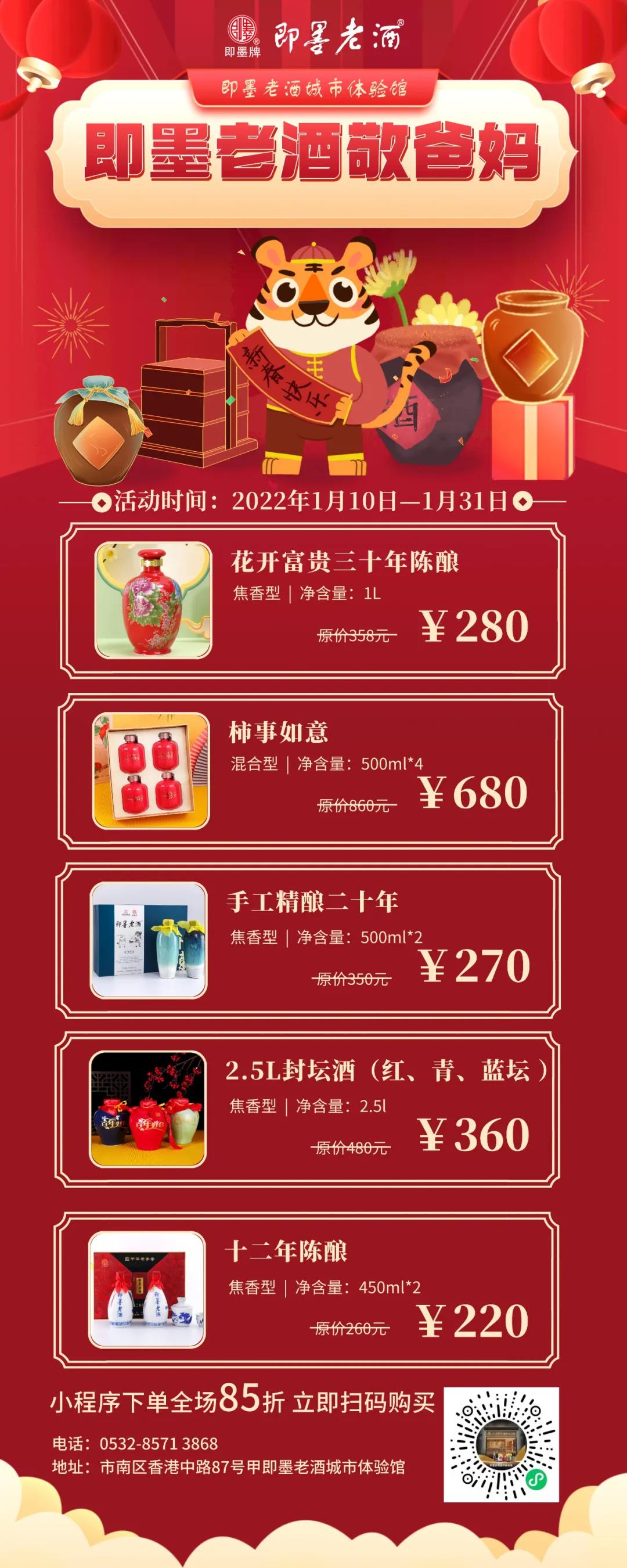 市民前往即墨老酒城市體驗(yàn)館,或掃描下圖中小程序下單,便能以團(tuán)購(gòu)價(jià)購(gòu)買“花開富貴30年”“柿事如意”等五款推薦產(chǎn)品,全場(chǎng)其他產(chǎn)品85折優(yōu)惠。活動(dòng)截止時(shí)間為1月31日,優(yōu)惠多多,抓緊時(shí)間~
