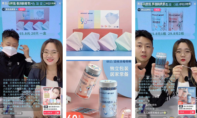 當(dāng)晚,海氏海諾帶來(lái)的產(chǎn)品有夏季透氣薄款透氣一次性口罩、KN95口罩柳葉形彩色漸變口罩、KN95口罩柳葉形口罩、一次性使用兒童口罩、迷你酒精濕巾、酒精、碘伏消毒液等產(chǎn)品,都是防疫常態(tài)化下的家庭生活必備用品。其中,彩色漸變口罩以其時(shí)下流行的莫蘭迪漸變色吸引了一波關(guān)注。棉棒結(jié)構(gòu)的消毒液,設(shè)計(jì)新穎,掰開(kāi)棒體,消毒液會(huì)慢慢滲透到消毒棉上,使用方便,特別適合寶媽照顧寶寶使用。