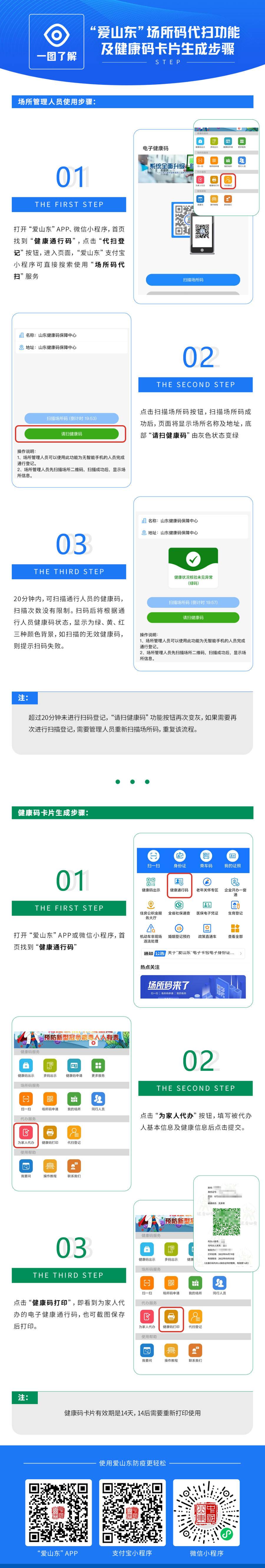 “愛山東”政務(wù)服務(wù)平臺(tái)移動(dòng)端(APP、支付寶及微信小程序)積極響應(yīng)省疫情防控有關(guān)部署,上線“代掃登記”服務(wù)。場所碼代掃功能如何用?健康碼卡片如何生成?一張圖告訴你!