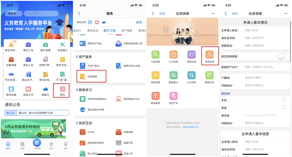 申請(qǐng)步驟如下。在“愛山東·青e辦”APP首頁(yè)點(diǎn)擊“更多”,在“房產(chǎn)服務(wù)”分類下,找到“住房保障”服務(wù),點(diǎn)擊進(jìn)入。點(diǎn)擊進(jìn)入后,在業(yè)務(wù)辦理頁(yè)面選擇“資格申請(qǐng)”點(diǎn)擊進(jìn)入,在申請(qǐng)人基本情況頁(yè)面根據(jù)真實(shí)情況填寫相關(guān)信息并提交。申請(qǐng)?zhí)峤缓?如需查看審核結(jié)果,可點(diǎn)擊“審核進(jìn)度”進(jìn)行查看。除住房保障資格申請(qǐng)服務(wù)外,還可查看公示公告信息、計(jì)分排序、配租合同及配租登記、租金繳納等操作。