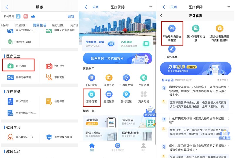 完成異地就醫(yī)備案是參保人在外地因意外臨時(shí)就醫(yī)要做的必備步驟。參保人可通過“愛山東·青e辦”APP內(nèi)的醫(yī)療保障服務(wù)辦理。參保人下載注冊“愛山東·青e辦”APP后,只需兩步即可掌上完成異地就醫(yī)備案。首先,在“愛山東·青e辦”APP首頁頂端搜索欄搜索“醫(yī)療保障”應(yīng)用或在首頁依次點(diǎn)擊更多-醫(yī)療衛(wèi)生-醫(yī)療保障;然后,在醫(yī)保常用的“意外傷害”分類下,找到“異地意外傷害住院備案”,根據(jù)提示填寫相應(yīng)信息后,即可辦理相應(yīng)備案手續(xù)。