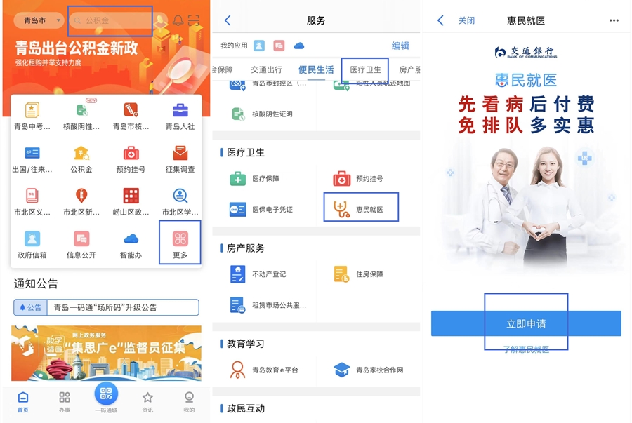 有需要的市民可在“愛山東·青e辦”APP首頁直接搜索“惠民就醫(yī)”,或依次點擊首頁更多—醫(yī)療衛(wèi)生—惠民就醫(yī),即可申請開通惠民就醫(yī)服務(wù)。審批通過后即為開通成功,辦理頁面可查看惠民就醫(yī)信息,同時也會發(fā)送短信告知惠民就醫(yī)額度等信息。