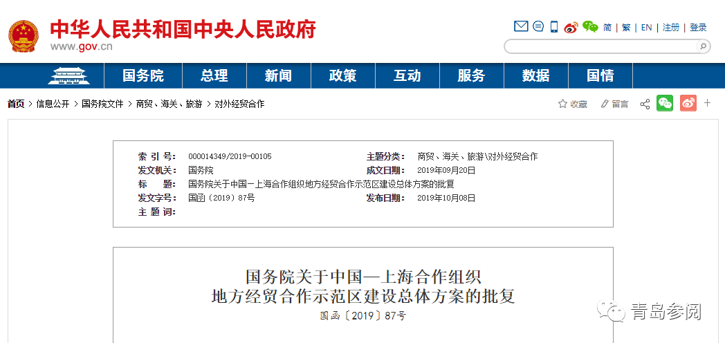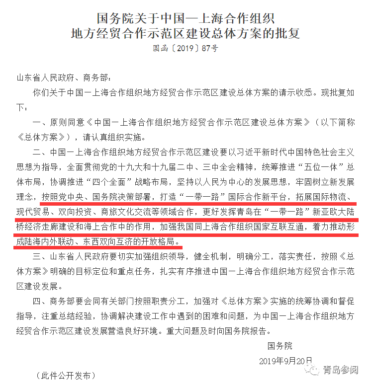 2019年10月8日,據(jù)中國政府網(wǎng)消息,國務院正式批復了關于中國—上海合作組織地方經(jīng)貿(mào)合作示范區(qū)建設總體方案,標志著位于青島上合示范區(qū)建設獲得了來自中央的支持與肯定。