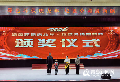 與會領(lǐng)導(dǎo)為在青島市中小學(xué)生垃圾分類短視頻征集活動中獲獎的環(huán)保小衛(wèi)士及其家長頒獎,以表彰他們?yōu)槔诸愖龀龅呢暙I。