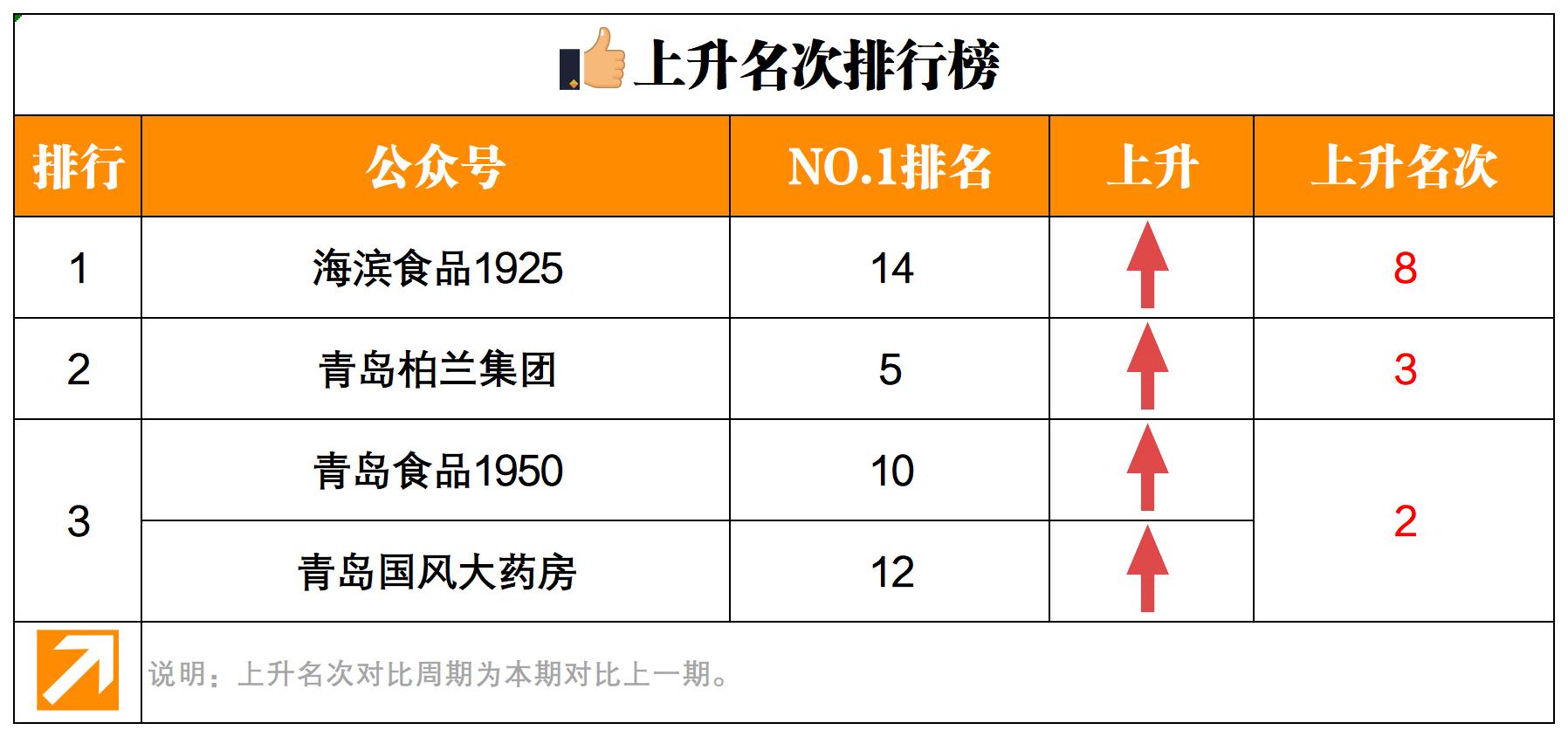 “青島食品1950”、“青島國風(fēng)大藥房”本期上升兩名,分別位居總榜單第十名、第十二名,同時位居上升名次排行榜第三。