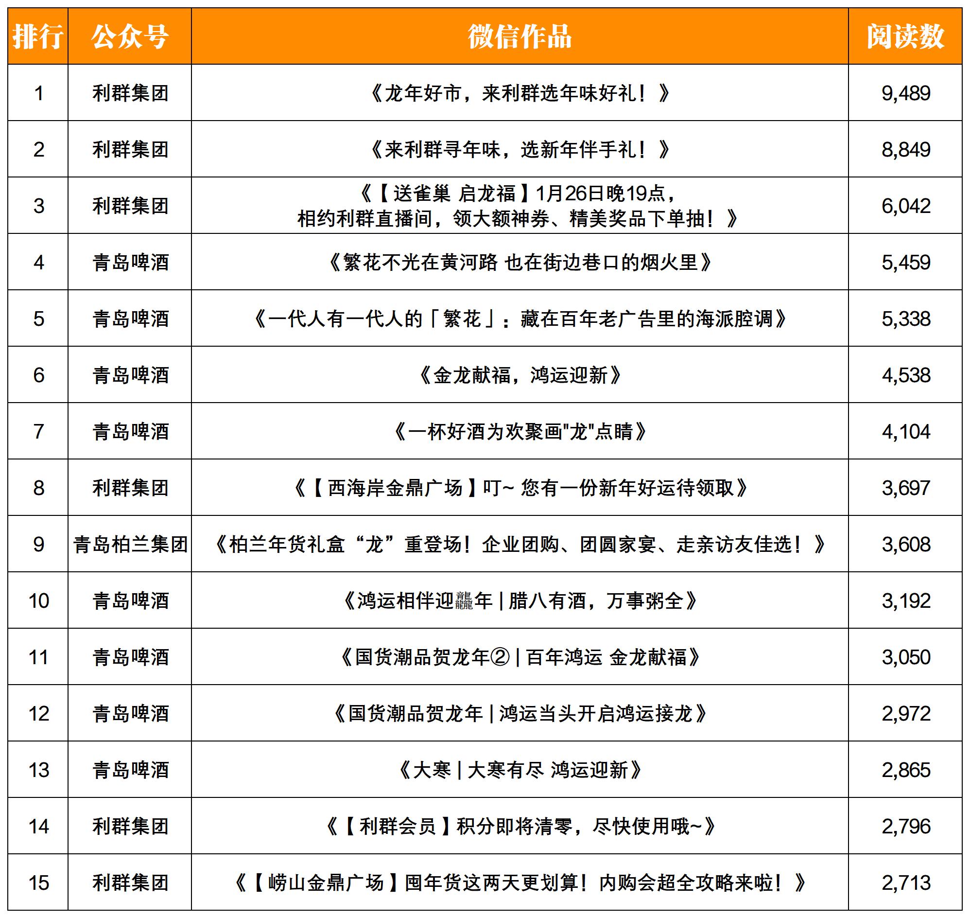 “利群集團”1月份發(fā)布文章27篇,總閱讀數(shù)6.2w+,蟬聯(lián)榜單冠軍;“青島啤酒”1月份發(fā)布文章11篇,總閱讀數(shù)3.7w+,位于榜單亞軍;“瑯琊臺集團”1月份發(fā)布文章19篇,總閱讀數(shù)1.4w+,位于榜單季軍。