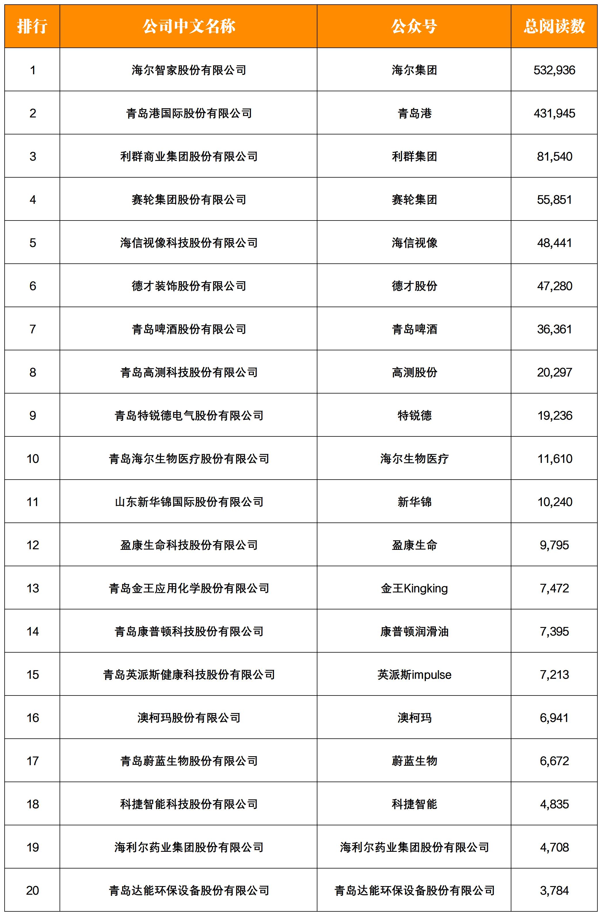 NO.6| 權威發(fā)布:青島上市企業(yè)微信影響力月度排行榜TOP20
