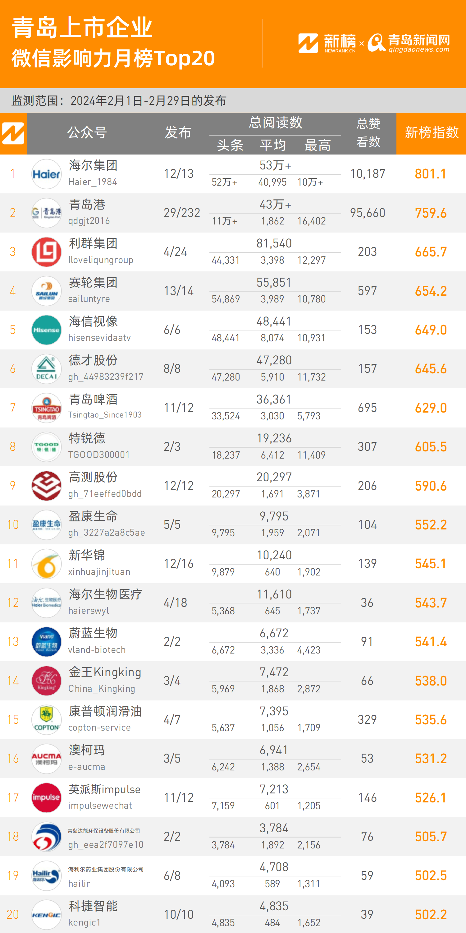 NO.1| 權威發(fā)布:2024年青島上市企業(yè)微信影響力月度排行榜TOP20