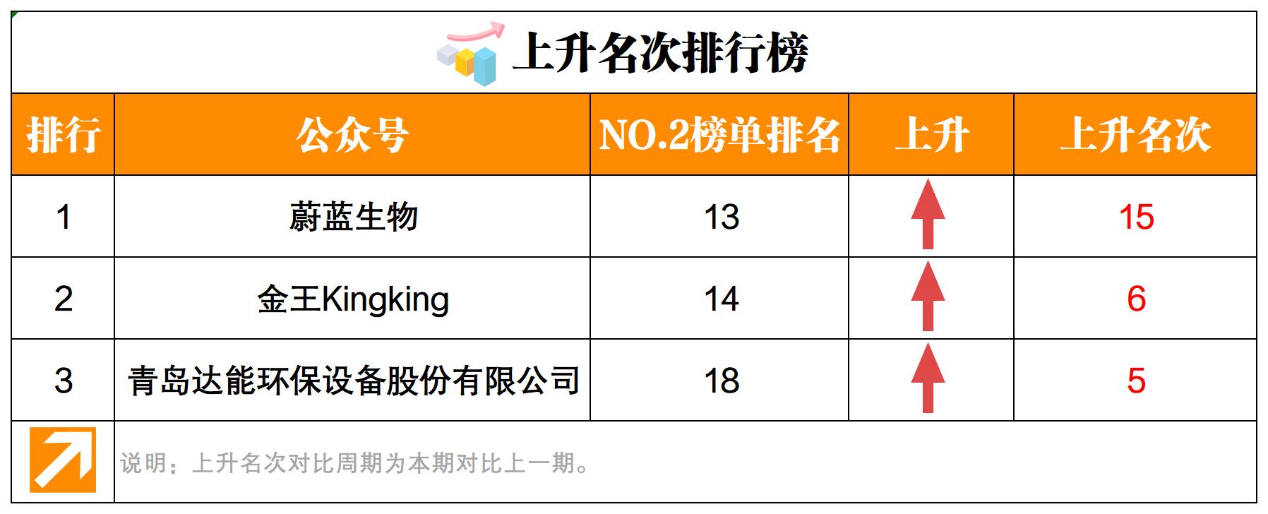 本期上升名次排行榜前三名分別是:“蔚藍生物”、“金王Kingking”、“青島達能環(huán)保設備股份有限公司”。