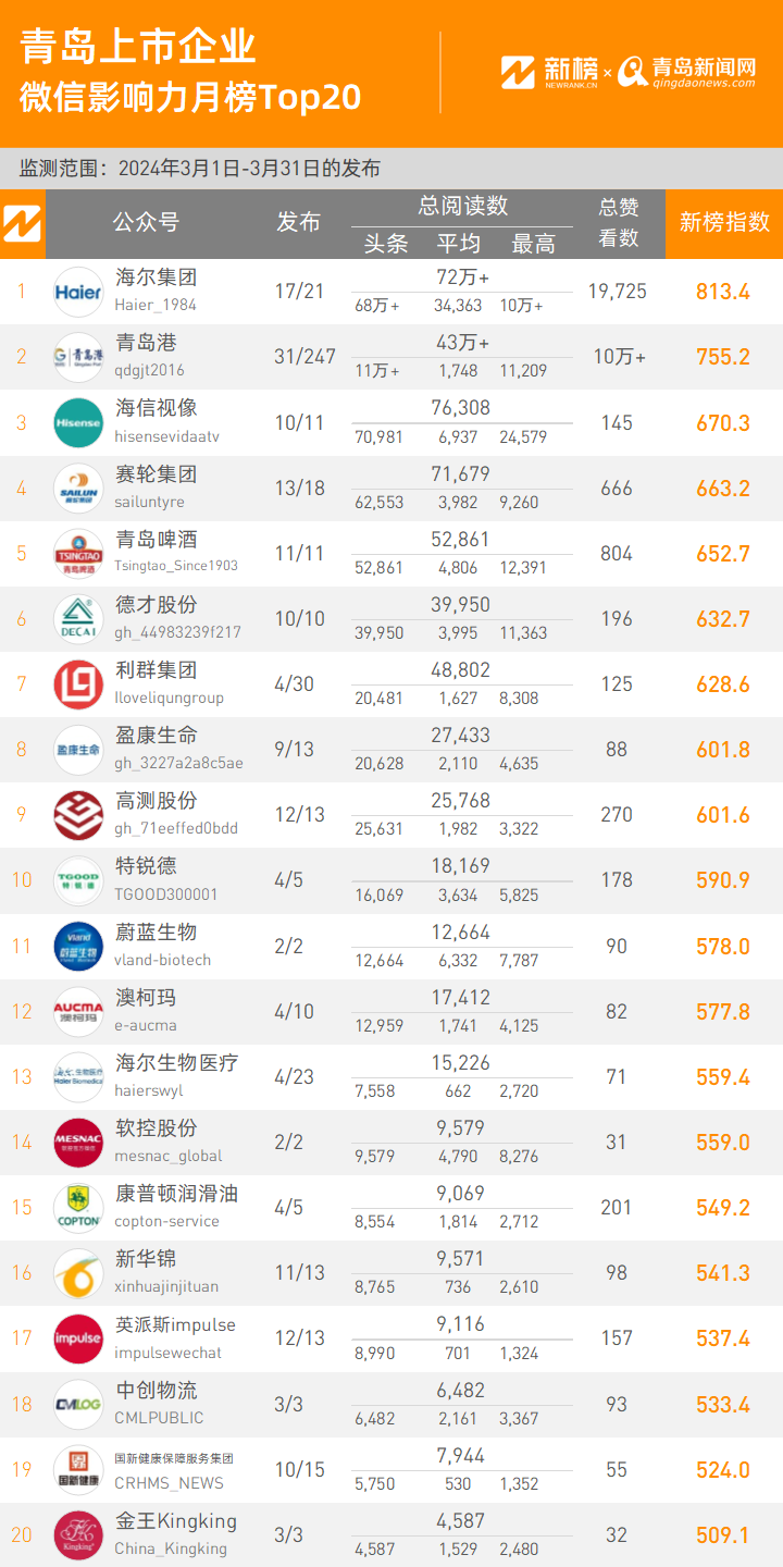 NO.1| 權(quán)威發(fā)布:2024年青島上市企業(yè)微信影響力月度排行榜TOP20
