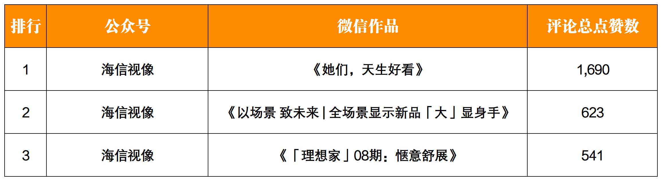 本期單篇作品最高評論總點(diǎn)贊數(shù)1690,出自賬號“海信視像”的《她們,天生好看》一文;排行第二、第三也均出自賬號“海信視像”的《以場景 致未來 | 全場景顯示新品「大」顯身手》一文和《「理想家」08期:愜意舒展》一文,評論總點(diǎn)贊數(shù)分別是623和541。