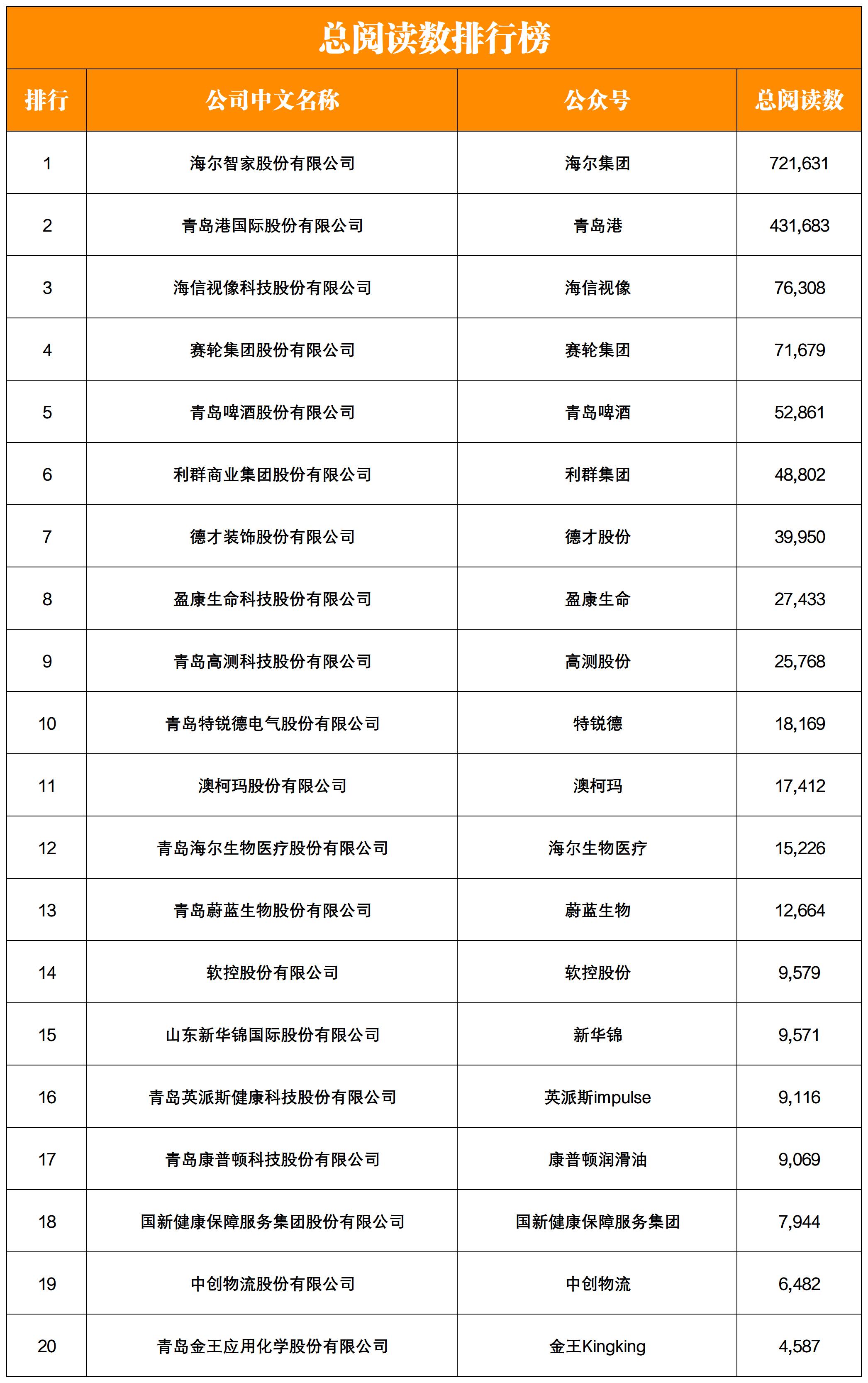 NO.1| 權(quán)威發(fā)布:青島上市企業(yè)微信影響力月度排行榜TOP20
