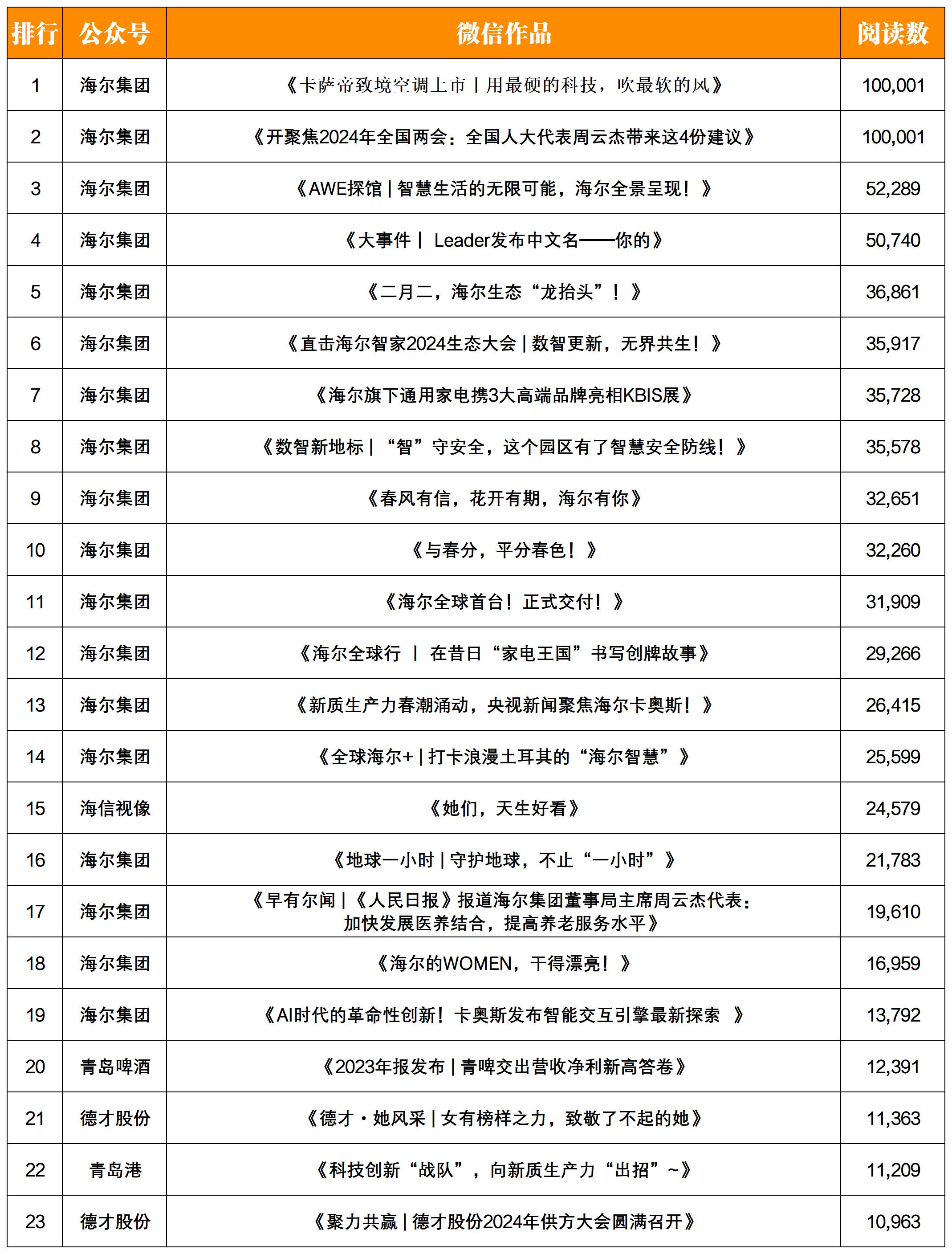 熱文方面,“海爾集團(tuán)”的《卡薩帝致境空調(diào)上市丨用最硬的科技,吹最軟的風(fēng)》和《聚焦2024年全國兩會(huì):全國人大代表周云杰帶來這4份建議》兩篇文章均喜提10w+閱讀。
