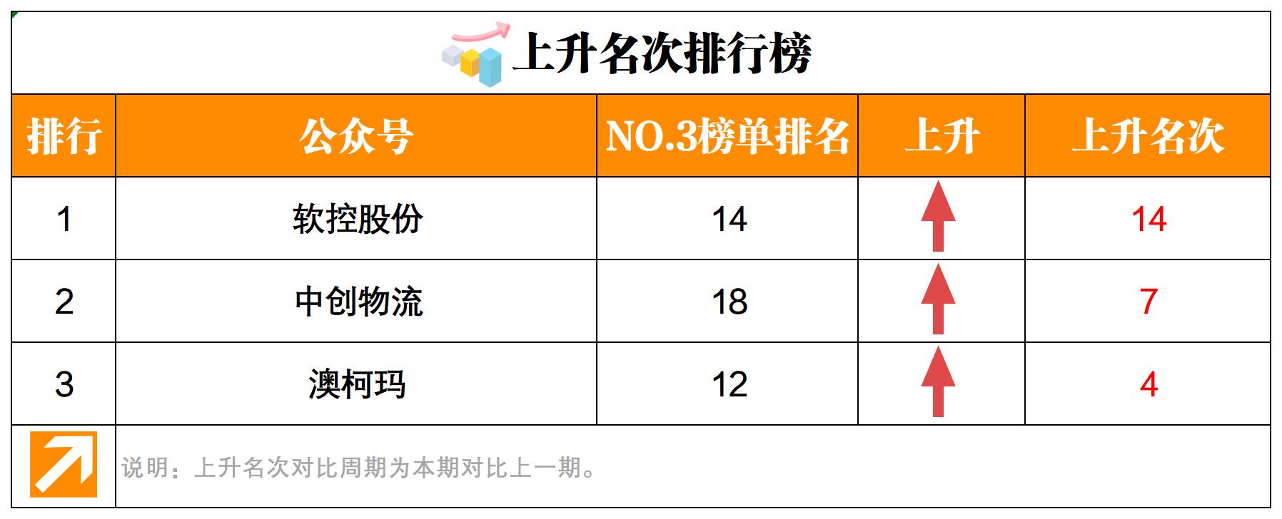 本期上升名次排行榜前三名分別是:“軟控股份”、“中創(chuàng)物流”、“澳柯瑪”。