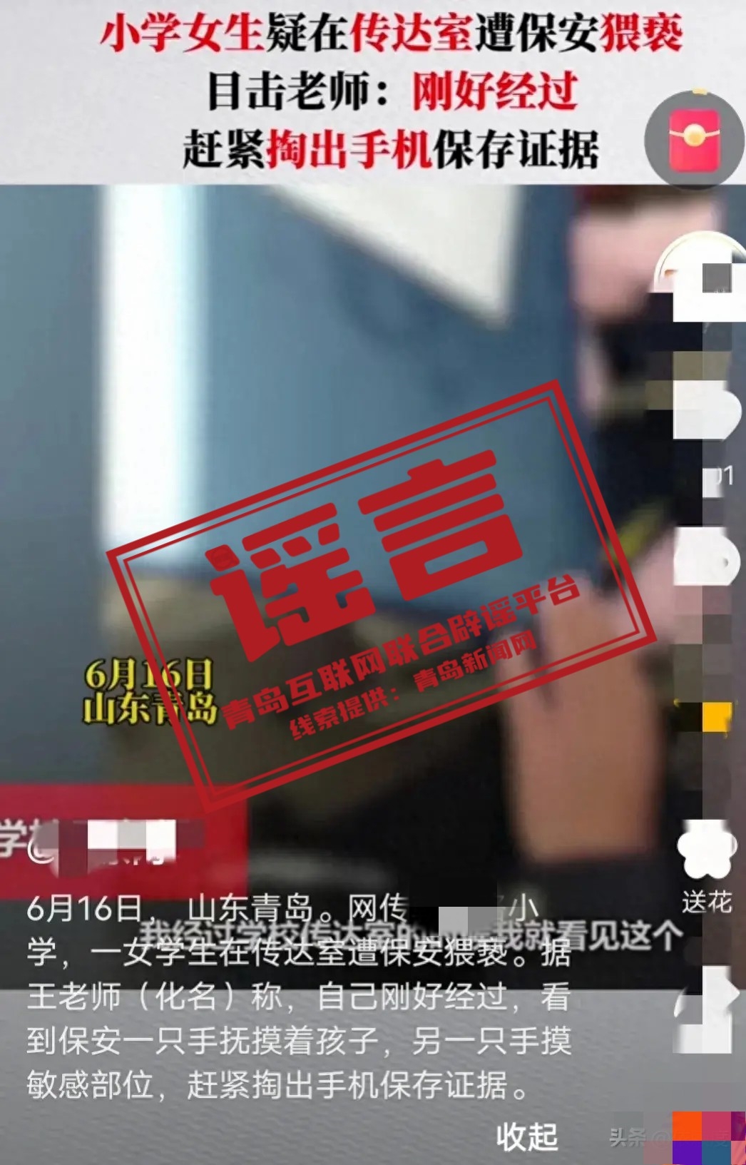 青島新聞網(wǎng)訊 6月16日下午,微博、今日頭條平臺(tái)有賬號(hào)發(fā)布消息稱“學(xué)生在傳達(dá)室遭保安猥褻”,經(jīng)調(diào)查,此事系謠言。