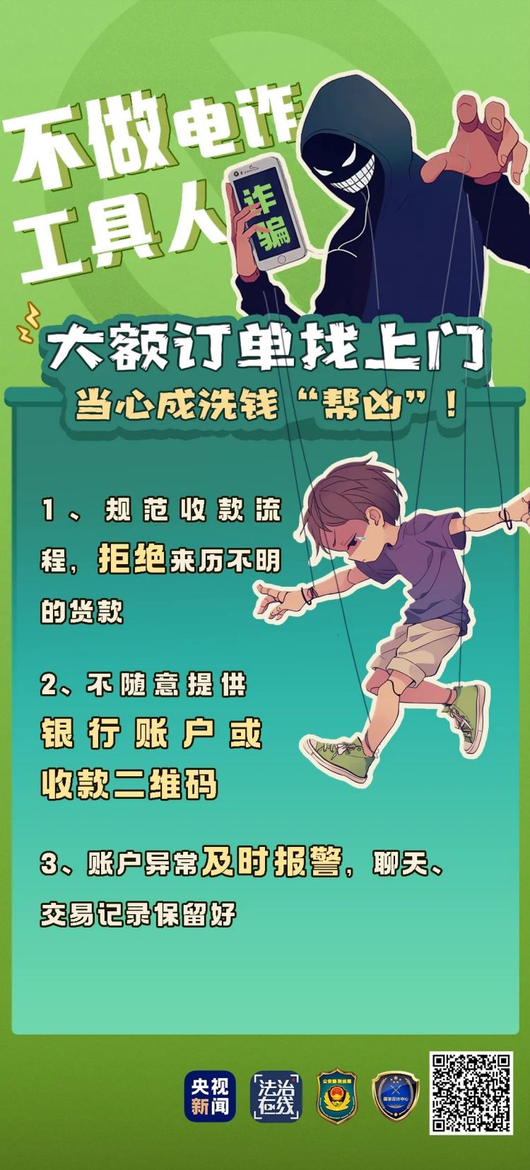 2.不要隨意提供自己的銀行賬戶或收款二維碼,避免無意中成為詐騙分子洗錢的工具;