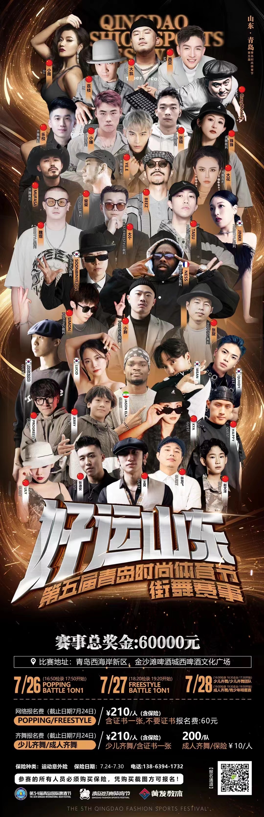 舞力全開、決戰(zhàn)巔峰!此次青島時尚體育節(jié)國際街舞大賽我們邀請到了來自法國的世界街舞冠軍大滿貫popping神級大師NESS;韓國超強街舞新生代戰(zhàn)神SOONBIN;力量與美的完美融合waacking女神Jinkii;明星演藝人MEAN、風格舞者Jogaloo、Lucid和Quiiidy;來自赤道幾內(nèi)亞的Hippop嘉賓Jason及圈內(nèi)多位國際級街舞裁判與嘉賓進行比賽判罰與表演,史詩級裁判陣容空前絕后,為大賽提供專業(yè)性的有力保障。更有來自Cruise Staff 娛樂部的專業(yè)DJ-LITCHI與中國街舞國家隊locking代表隊成員-CRAZY MONKEY做為MC強強聯(lián)合,用勁爆的音樂與專業(yè)的解說來點燃現(xiàn)場氣氛,掀起青春浪潮,引爆夏日激情。還有神秘的裁判秀給市民游客一場精彩的視覺盛宴。