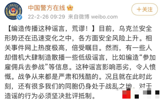 針對此類謠言,@中國警方在線曾經(jīng)表示,這種謠言影響惡劣,令人憤慨。戰(zhàn)爭從來都是嚴(yán)肅和殘酷的,況且就在此時此刻,還有很多我們的同胞仍身處于戰(zhàn)亂之地。對于造謠的行為必須堅決批評抵制。