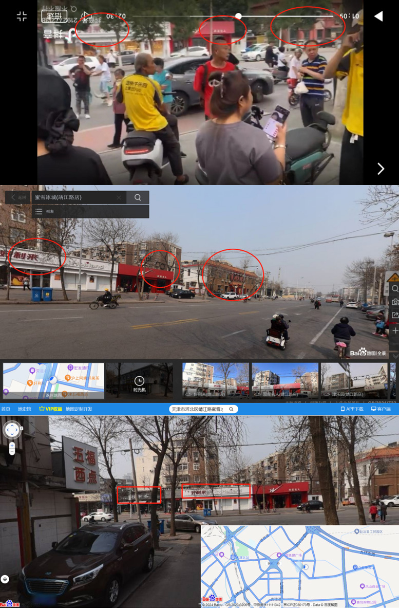 (在百度地圖搜索天津市事發(fā)地點某連鎖飲品店,視頻中的場景和當?shù)氐貓D街景高度相似。最上方圖為網(wǎng)友爆料事件視頻截圖,下面2張圖片為百度地圖街景圖。)