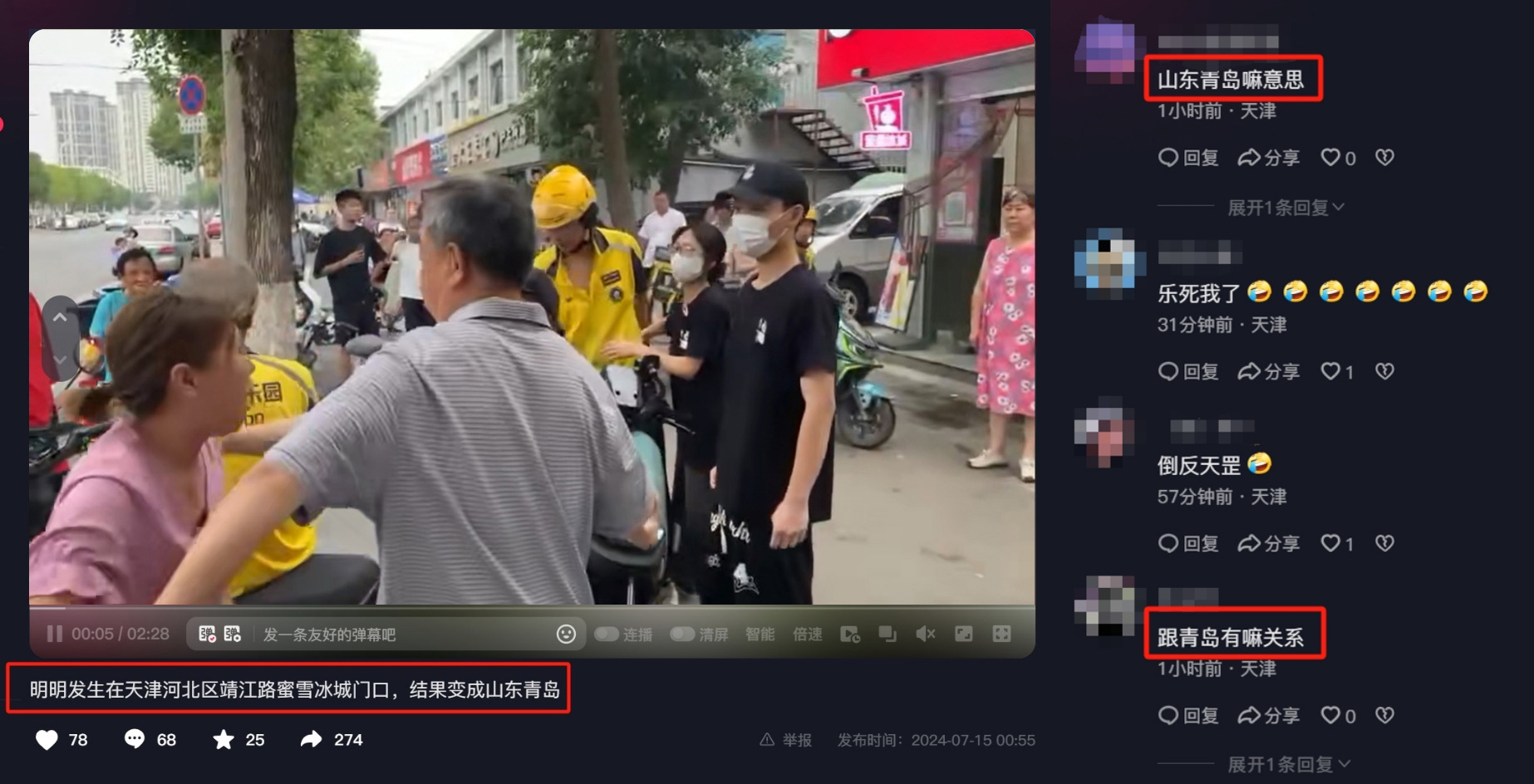 記者聯(lián)系上了該事件完整視頻的發(fā)布者。該網(wǎng)友表示,視頻中的事件發(fā)生地點為天津市某連鎖飲品店的門口,并非發(fā)生在山東省青島市。而且在視頻的標題文案和網(wǎng)友評論中,也提到“明明發(fā)生在天津,結果變成山東青島”“跟青島有嘛關系”。