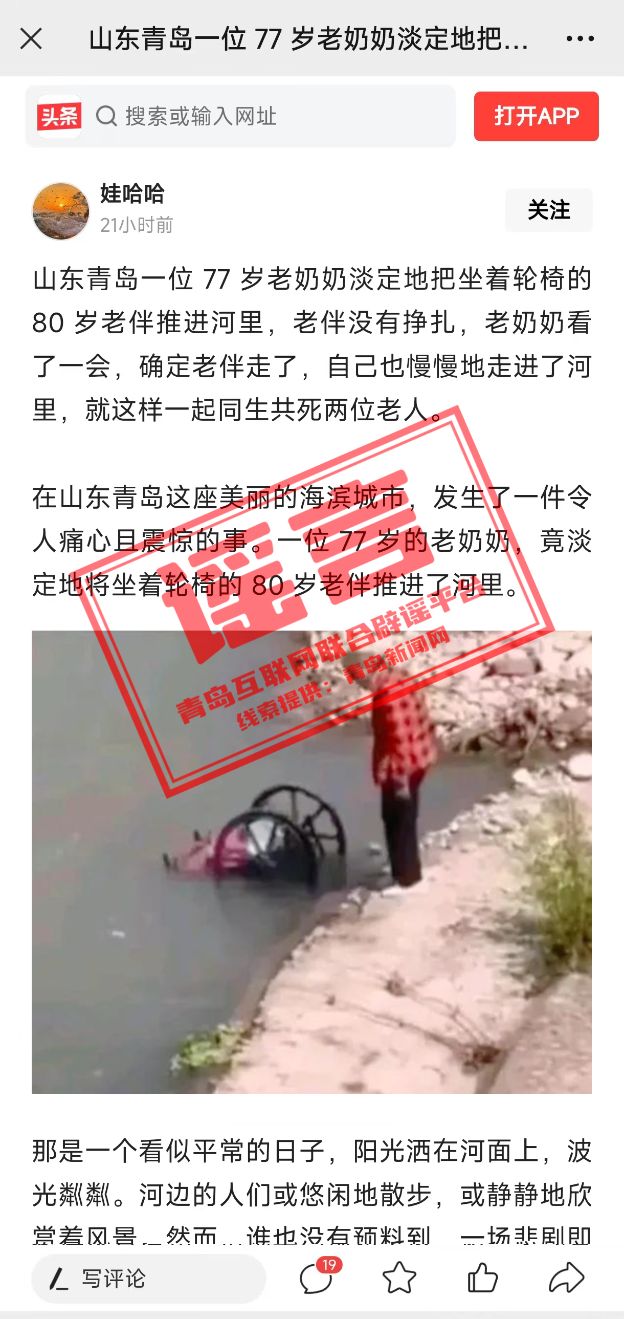 青島新聞網(wǎng)訊 7月25日,名為“娃哈哈”的賬號在今日頭條發(fā)布題為《青島一老奶奶把坐著輪椅的老伴推進河里》的圖文資訊,引起網(wǎng)絡(luò)關(guān)注。經(jīng)查,此事不實。