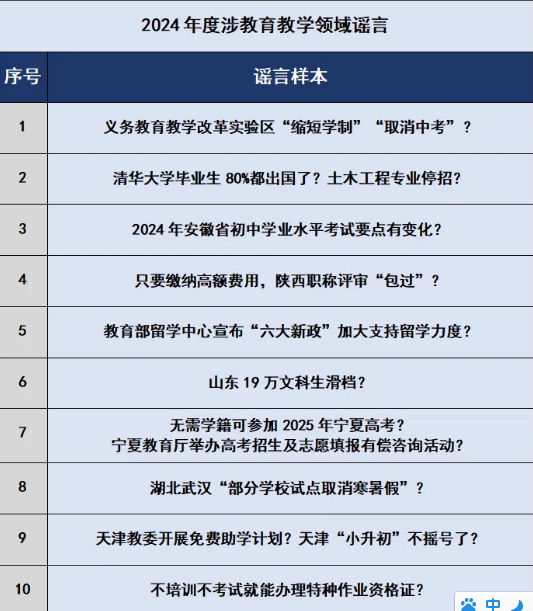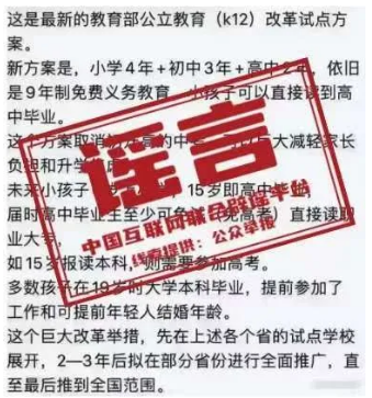 涉教育教學(xué)領(lǐng)域謠言利用廣大學(xué)生和家長(zhǎng)對(duì)中招高招、學(xué)制改革、留學(xué)教育、求職招聘等信息的關(guān)切心理,在“招生”“考試”“寒暑假”等時(shí)間節(jié)點(diǎn),散布不實(shí)信息,引發(fā)學(xué)生和家長(zhǎng)不必要的教育焦慮,擾亂正常的招考秩序。