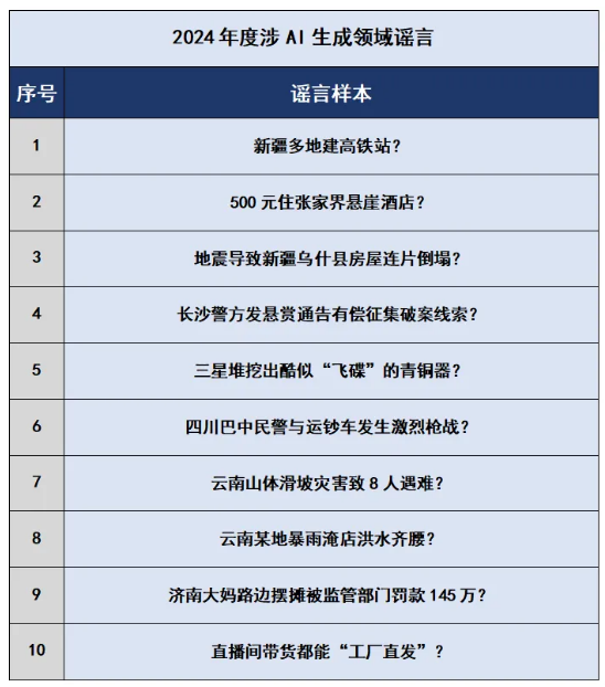 2024年初,“新疆多地建高鐵站”虛假短視頻在網(wǎng)上流傳,此類視頻由軟件智能合成,用戶只需使用指定視頻模板、手動(dòng)替換涉本人家鄉(xiāng)相關(guān)地點(diǎn)的文字即可生成新視頻,利用人們對(duì)家鄉(xiāng)基礎(chǔ)設(shè)施建設(shè)情況的關(guān)注而大肆傳播,誤導(dǎo)公眾。還有個(gè)別網(wǎng)民為獲取流量和不當(dāng)利益,利用AI軟件蓄意歪曲“交警請(qǐng)占道停留的運(yùn)鈔車駛離”的事實(shí),編造謠言“四川巴中民警與運(yùn)鈔車發(fā)生激烈槍?xiě)?zhàn)”,造成公眾恐慌和誤解。此外,謠言“濟(jì)南大媽路邊擺攤被監(jiān)管部門罰款145萬(wàn)”實(shí)為AI工具生成的虛假文章,大肆消費(fèi)公眾的同情心博取眼球,引發(fā)大范圍傳播,造成不良社會(huì)影響,相關(guān)違法人員被公安機(jī)關(guān)依法行政拘留?!霸颇仙襟w滑坡災(zāi)害致8人遇難”“地震導(dǎo)致新疆烏什縣房屋連片倒塌”“云南某地暴雨淹店洪水齊腰”等謠言則純屬子虛烏有,均為AI特效炮制的虛假視頻,利用公眾對(duì)災(zāi)難事件的重視編造傷亡情況,制造恐慌情緒,擾亂社會(huì)秩序。
