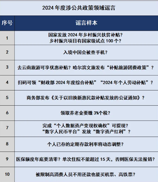 2024年3月,有不法分子冒用國(guó)家機(jī)關(guān)名義,假稱“國(guó)家發(fā)放2024年鄉(xiāng)村振興扶貧補(bǔ)貼”“鄉(xiāng)村振興項(xiàng)目有國(guó)家級(jí)試點(diǎn)100個(gè)”,以高額返利為誘餌,引誘大量不明真相的群眾加入所謂的各類“基金會(huì)”和“項(xiàng)目”,巧立名目騙取錢財(cái)。還有自媒體從公開(kāi)發(fā)布的政策信息中摘取碎片化信息,斷章取義,對(duì)政策歪曲解讀。如2024年10月,個(gè)別自媒體故意混淆“個(gè)人養(yǎng)老金”與“基本養(yǎng)老金”的概念,傳播“領(lǐng)取養(yǎng)老金要繳3%個(gè)稅”“養(yǎng)老金個(gè)稅起征點(diǎn)為5000元”等不實(shí)信息,引發(fā)公眾誤解。此外,在《國(guó)家安全機(jī)關(guān)行政執(zhí)法程序規(guī)定》和《國(guó)家安全機(jī)關(guān)辦理刑事案件程序規(guī)定》公布之際,一些別有用心之人借機(jī)造謠抹黑、搬弄是非,大肆炮制所謂“入境中國(guó)都會(huì)被查手機(jī)”的謠言,荒謬至極。