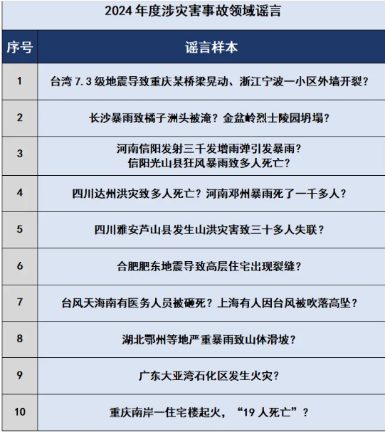 2024年4月初,臺(tái)灣花蓮縣海域發(fā)生7.3級(jí)地震后,有網(wǎng)民編造“地震導(dǎo)致重慶某橋梁晃動(dòng)”“浙江寧波一小區(qū)外墻開(kāi)裂”等謠言混淆視聽(tīng),引發(fā)恐慌。2024年汛期,暴雨、臺(tái)風(fēng)接連來(lái)襲,全國(guó)多地災(zāi)情嚴(yán)峻,個(gè)別自媒體和網(wǎng)民為博取關(guān)注、吸引流量,或夸大其詞,或移花接木,或無(wú)中生有,借機(jī)發(fā)布“河南信陽(yáng)發(fā)射三千發(fā)增雨彈引發(fā)暴雨”“長(zhǎng)沙暴雨致橘子洲頭被淹”“四川達(dá)州洪災(zāi)致多人死亡”“河南鄧州暴雨死了一千多人”“臺(tái)風(fēng)天海南有醫(yī)務(wù)人員被砸死”“上海有人因臺(tái)風(fēng)被吹落高墜”等不實(shí)信息,引發(fā)群眾恐慌,造成不良社會(huì)影響。此外,謠言“廣東大亞灣石化區(qū)發(fā)生火災(zāi)”則是利用人們對(duì)人身財(cái)產(chǎn)安全的重視以及對(duì)環(huán)保安防設(shè)施“火炬”(一種高溫燃燒裝置,石油化工企業(yè)用于保障生產(chǎn)穩(wěn)定、減少環(huán)境污染的安防設(shè)施設(shè)備)的不了解,蓄意制造焦慮,擾亂社會(huì)秩序。