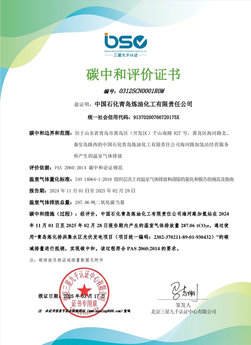青島煉化公司海河路加氫站于3月17日通過權(quán)威機(jī)構(gòu)評(píng)價(jià),獲得“碳中和”證書,成為我國(guó)首座“碳中和”加氫站。