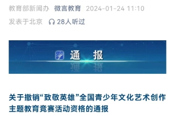 教育部:撤銷“致敬英雄”全國青少年文化藝術(shù)創(chuàng)作主題教育競賽活動(dòng)資格