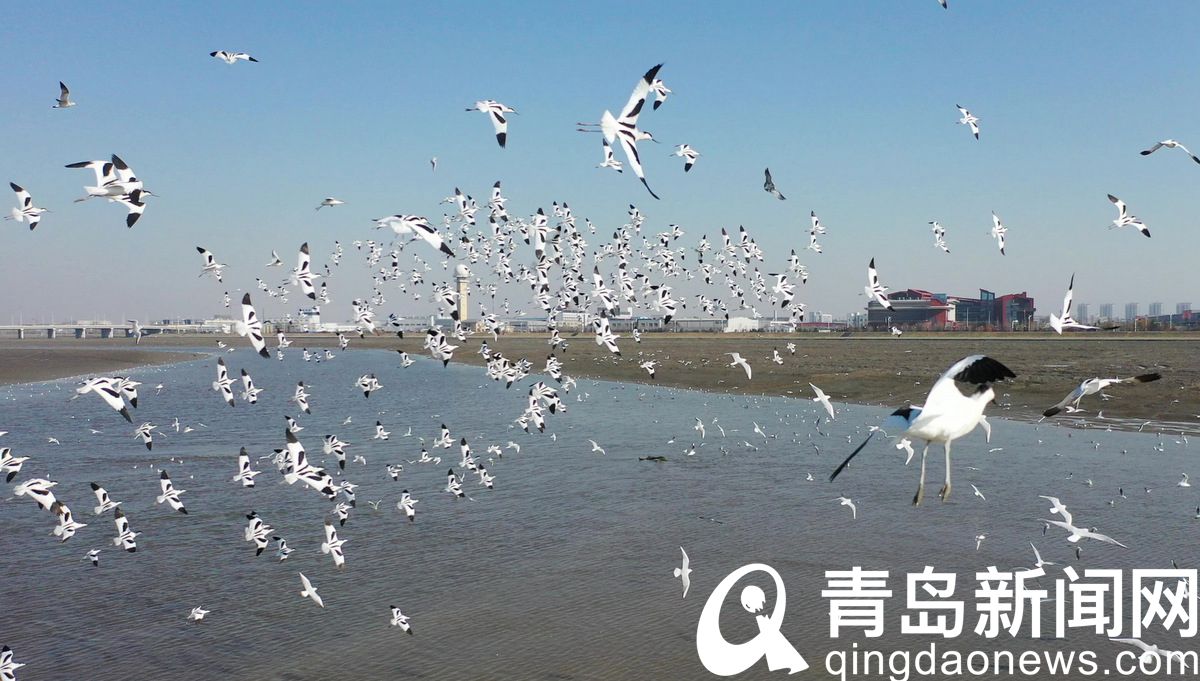 白沙河膠州灣入??谟瓉怼傍B浪” 上千只候鳥到灘涂上覓食