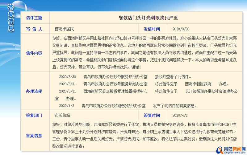 【民聲追訪】餐飲店燈光刺眼擾民 西海岸責(zé)令整改!