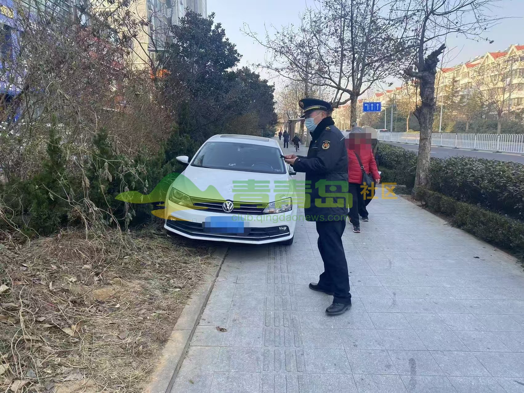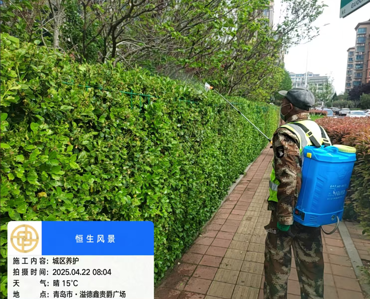 城陽區(qū)一人行道灌木冬青發(fā)生嚴(yán)重蟲害 相關(guān)部門立即噴藥防治