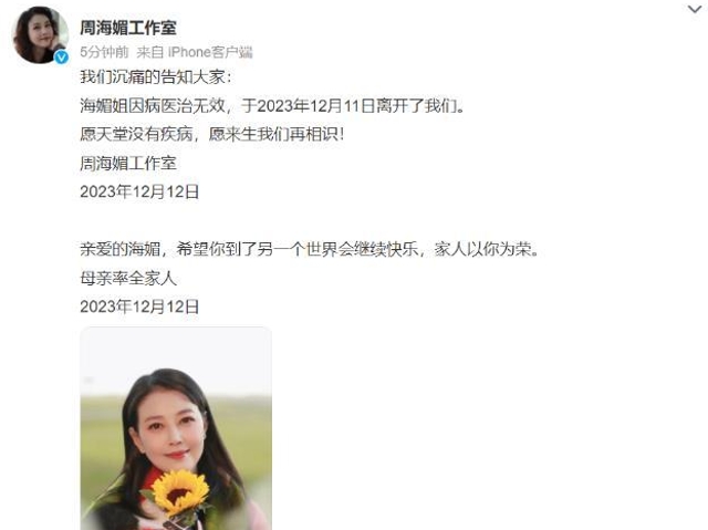 著名女演員周海媚去世 曾在《倚天屠龍記》中演周芷若