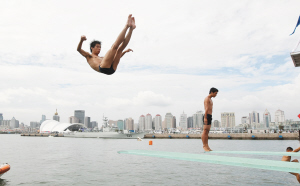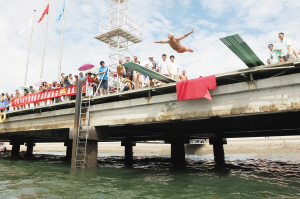 在奧帆中心內(nèi)進(jìn)行的海洋節(jié)高臺(tái)跳水表演。 記者 徐崇德 攝